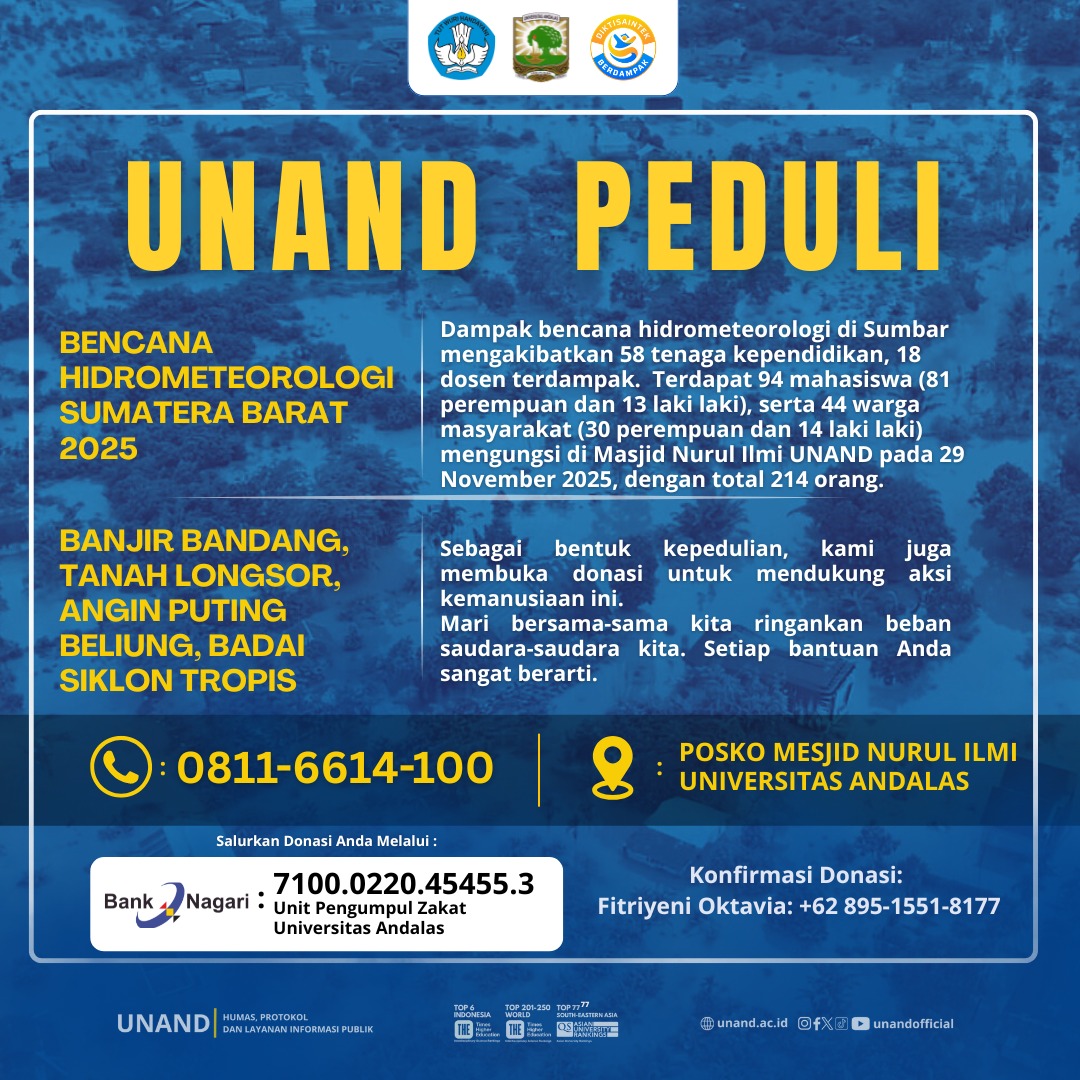 UNAND juga membuka kesempatan bagi sivitas akademika, alumni, mitra, dan masyarakat luas untuk ikut berkontribusi melalui donasi. Donasi sangat dibutuhkan untuk membantu pemulihan rumah warga, penyediaan kebutuhan dasar, dan rehabilitasi awal baik bagi masyarakat maupun mahasiswa/kos-an yang terdampak.
