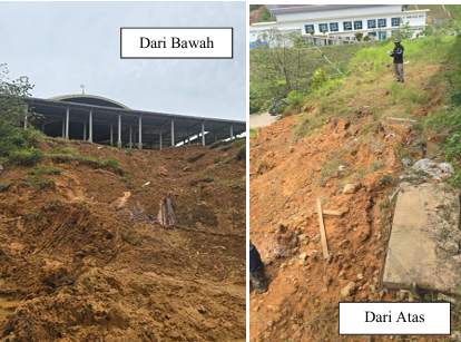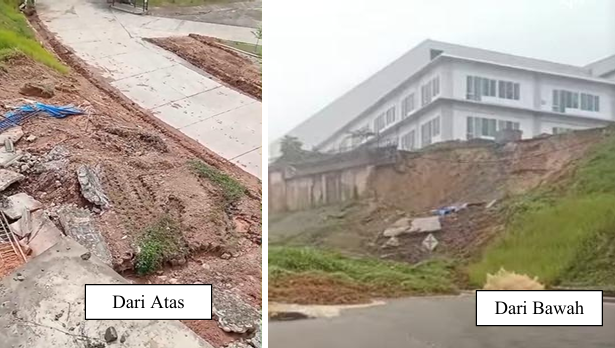 Hasil tinjauan lapangan menunjukkan bahwa longsor yang terjadi pada umumnya merupakan longsor permukaan (shallow landslide). Pada lokasi Fakultas Syariah, longsor dipengaruhi oleh kejenuhan tanah akibat infiltrasi air hujan dan sistem drainase yang belum berfungsi optimal. Kondisi tanah yang melunak saat jenuh menyebabkan terjadinya pergerakan tanah menyerupai aliran, dengan bidang gelincir yang tampak jelas pada permukaan lereng. Situasi ini mengindikasikan kombinasi faktor kemiringan lereng, karakteristik tanah, serta pengelolaan air permukaan yang belum memadai.