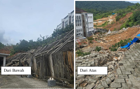 Sementara itu, pada area Fakultas Ekonomi dan Bisnis Islam (FEBI), kerusakan yang terjadi tidak hanya berupa longsoran tanah, tetapi juga kegagalan total pada konstruksi penahan tanah. Tekanan lateral tanah yang meningkat akibat kejenuhan dan akumulasi air tidak dapat dilepaskan secara efektif karena sistem drainase yang tidak memadai. Hal ini menyebabkan struktur penahan tanah mengalami retak, pergeseran, hingga runtuh secara menyeluruh. Kondisi tersebut menunjukkan bahwa kapasitas struktur eksisting tidak lagi mampu menahan beban tanah dan air yang bekerja, sehingga diperlukan evaluasi dan perancangan ulang sistem penahan lereng.
