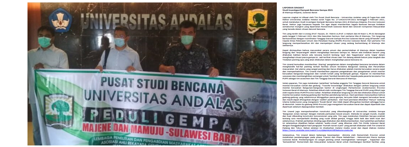 Tim PSB Unand telah melakukan kegiatan studi investigasi dampak bencana gempa Mamuju dan Majene Sulawesi Barat terhadap fasilitas kehidupan termasuk bangunan, prasarana jalan, dan elektrikan. Keberangkatan tim PSB bertujuan untuk melakukan kajian terhadap kerusakan bangunan serta membantu pemerintah Sulawesi Barat dalam memperbaiki bangunan yang rusak pasca gempa sekaligus sharing tentang rehabilitasi bangunan pasca gempa yang terjadi tahun 2009 di Padang.